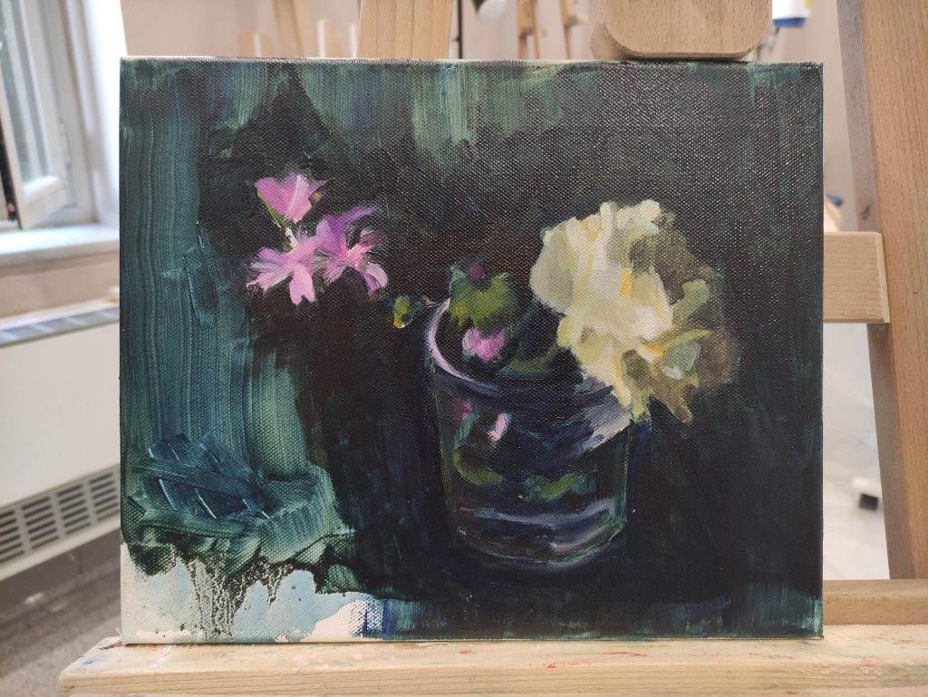 Bodegón con flores al óleo pintado por Raúl Moreira. Detalle.