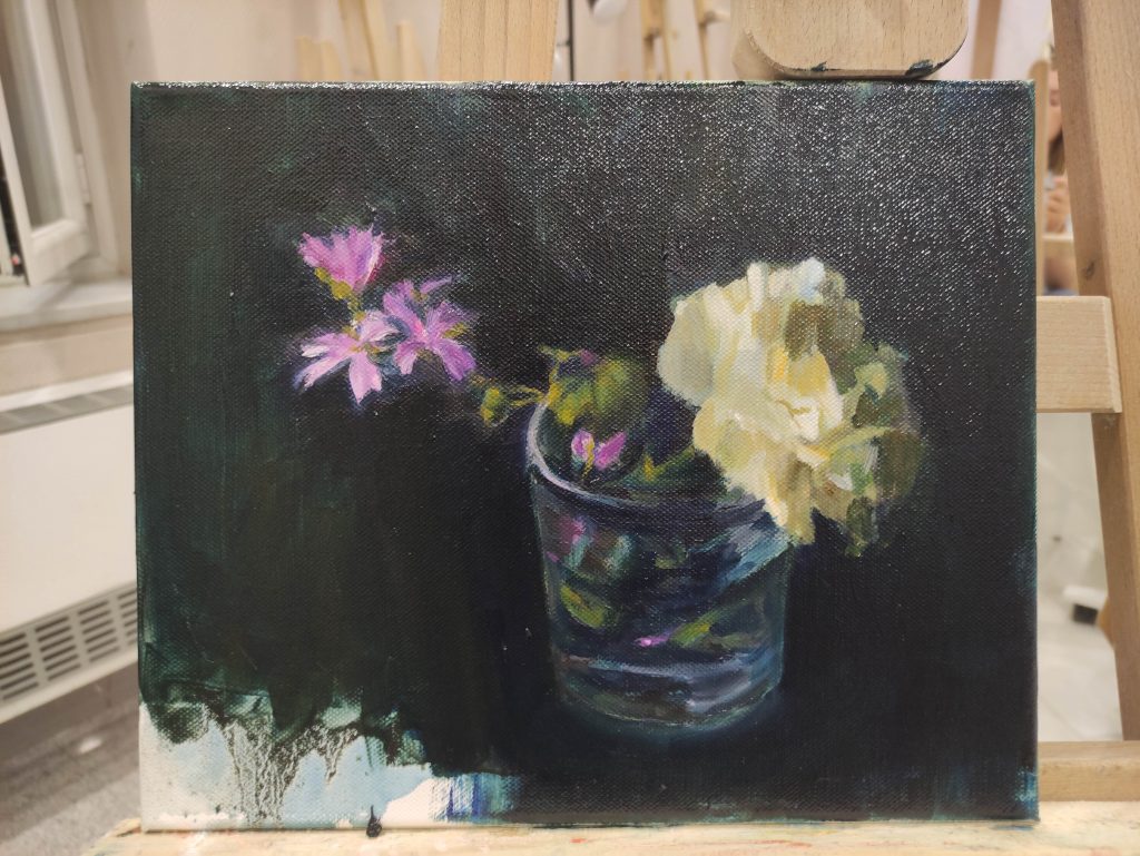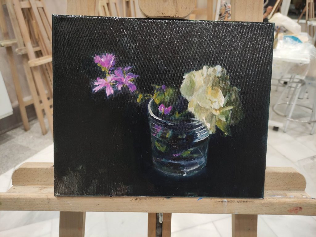 Bodegón con flores al óleo pintado por Raúl Moreira. Detalle.